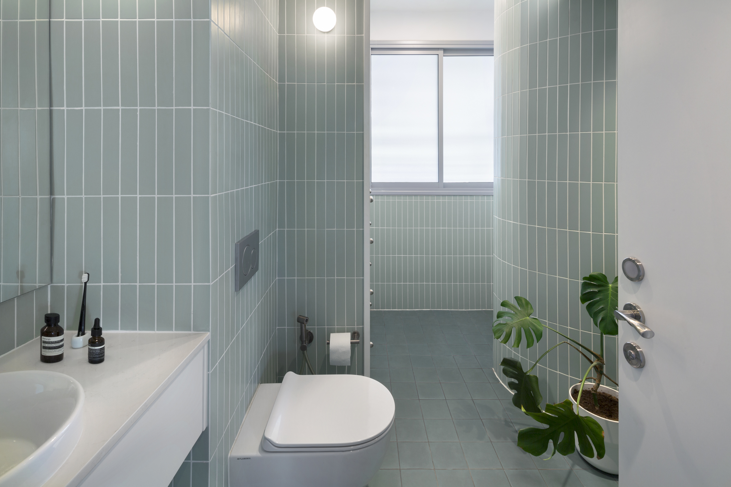 A formerly seperated bathroom and servcie room were reconnected into one space using a mint green tiles grid. Instead of using a door to formaly seperate, a curved wall blurs the two spaces; storage and household work happen on one side and bathing on the other - alone but together.